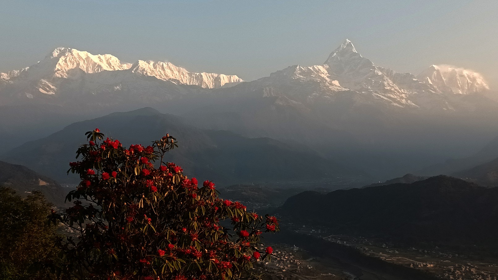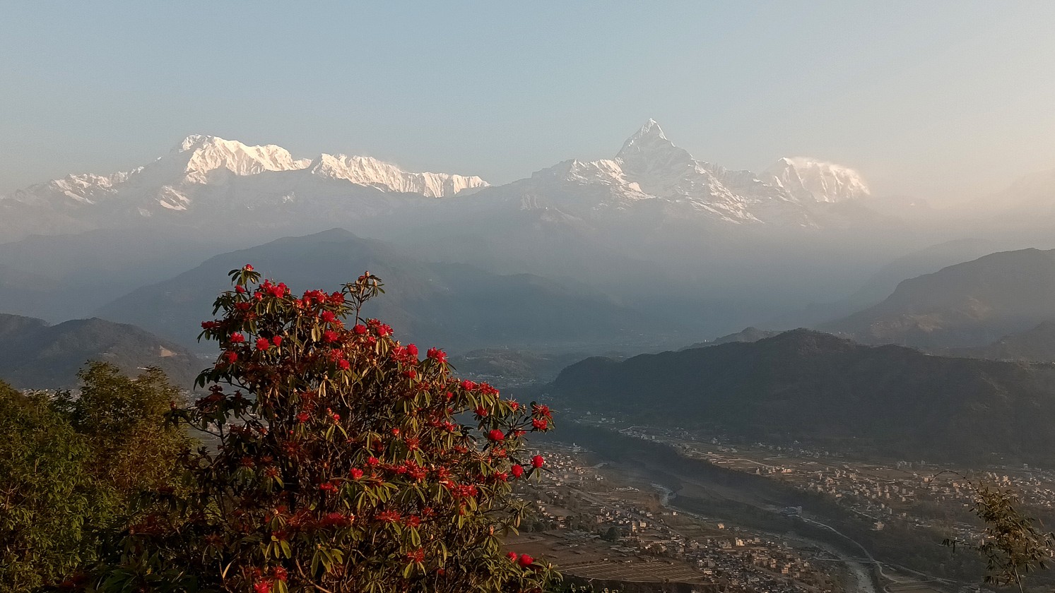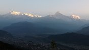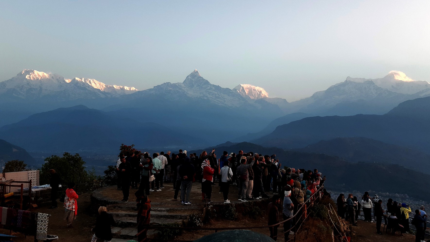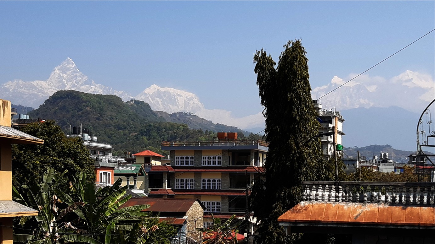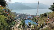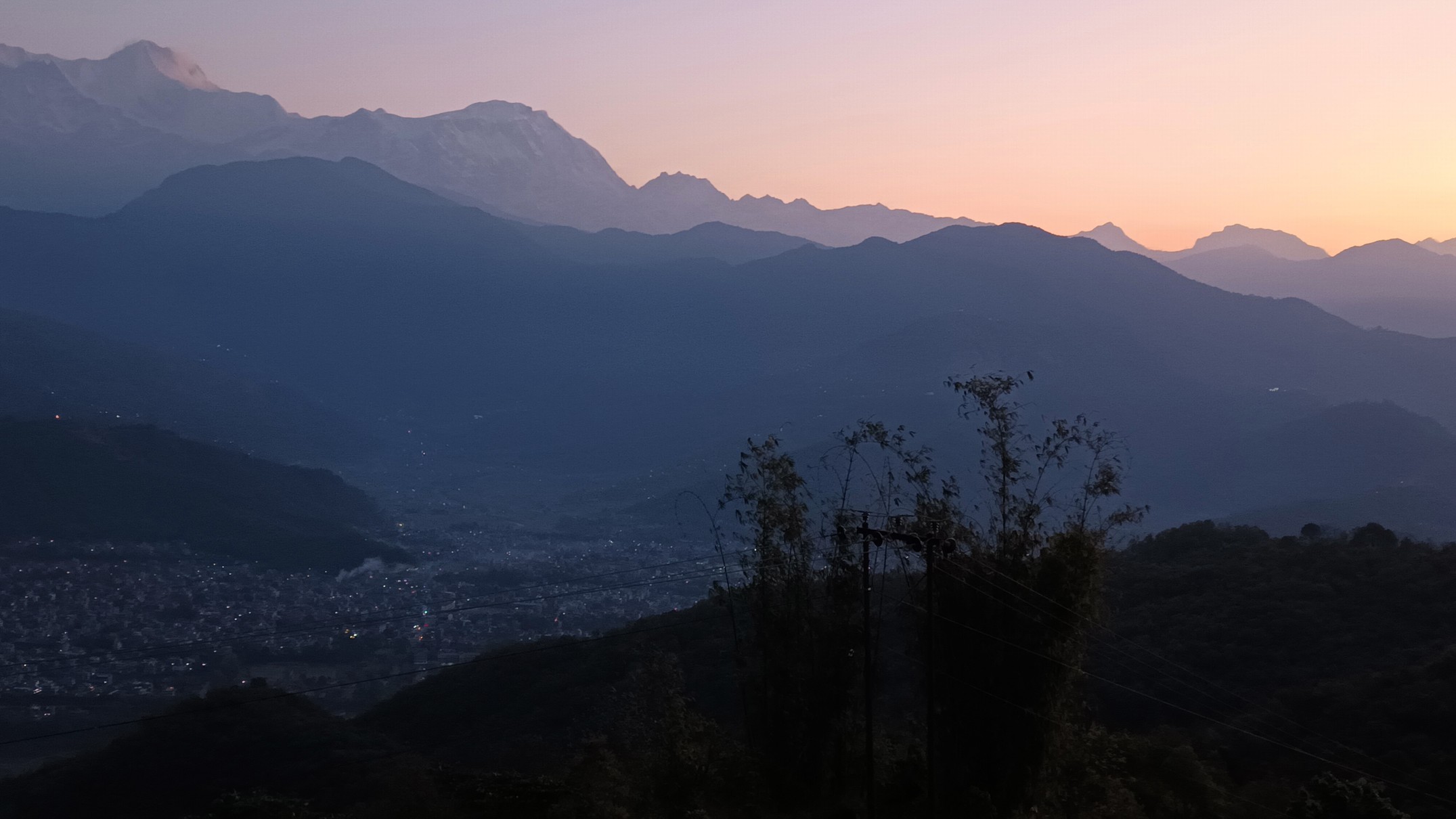 Autobusem trvá 200 km do Pokhary kolem 8 hodin, většinu času se projíždí po rozbité silnici nebo staveništěm. Tradiční nepálský populární jogurtový nápoj lassi. Svítání s výhledem na masív Annapuren a horu Mačapučare (Machhapuchhre - nepálsky Rybí ocas) vysokou 6.993 m n.m. Jezero Phewa. Vrchol Pumdikot se sochou boha Šivy.