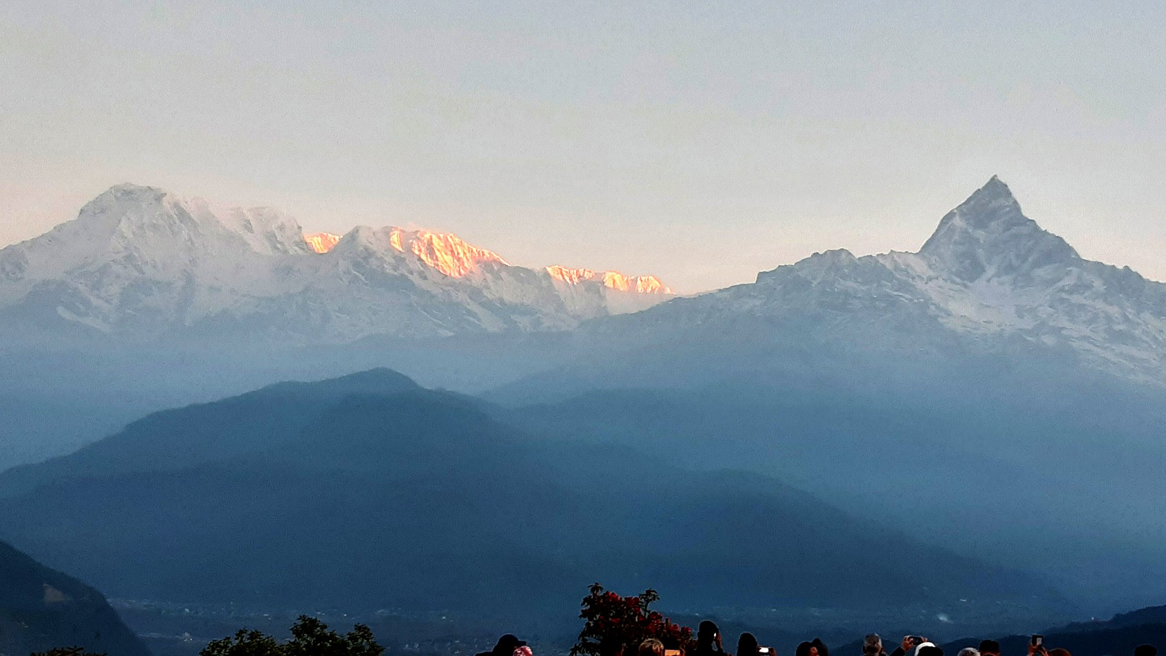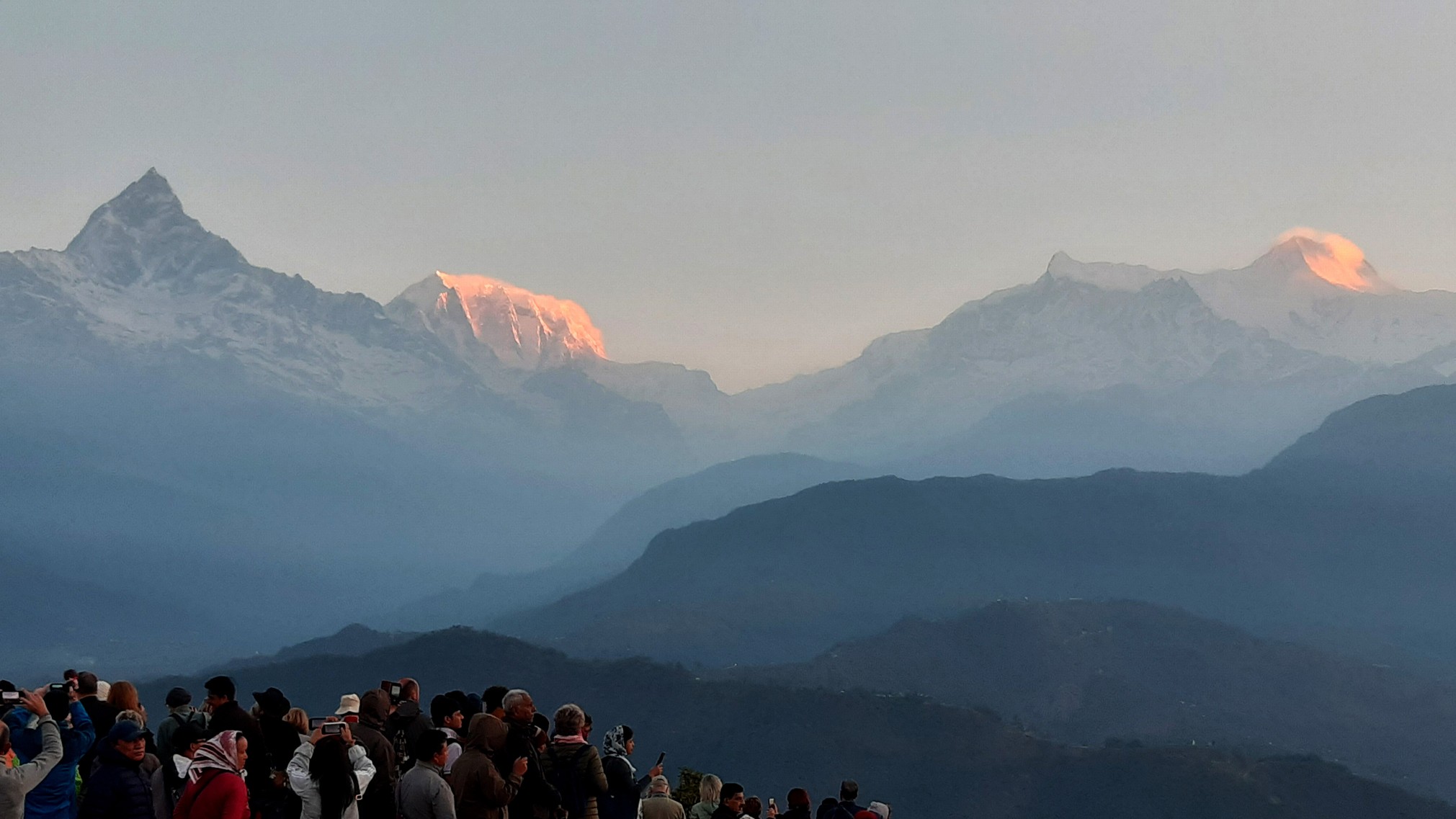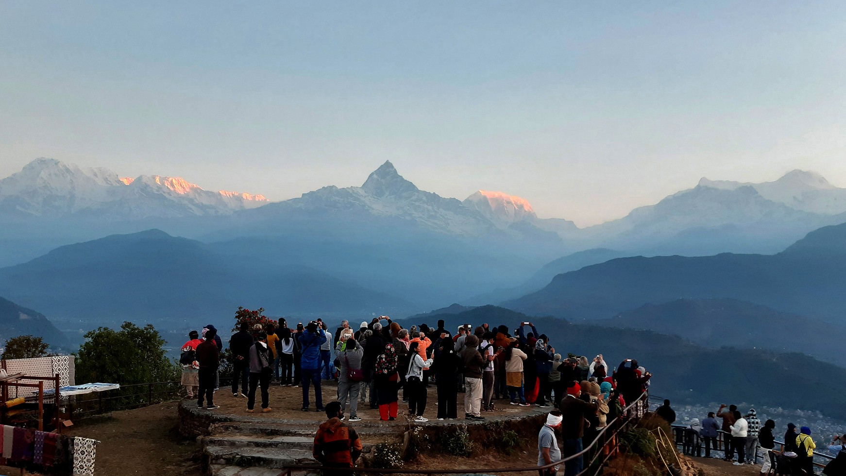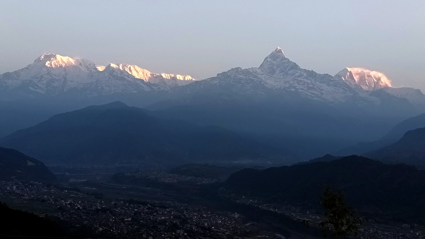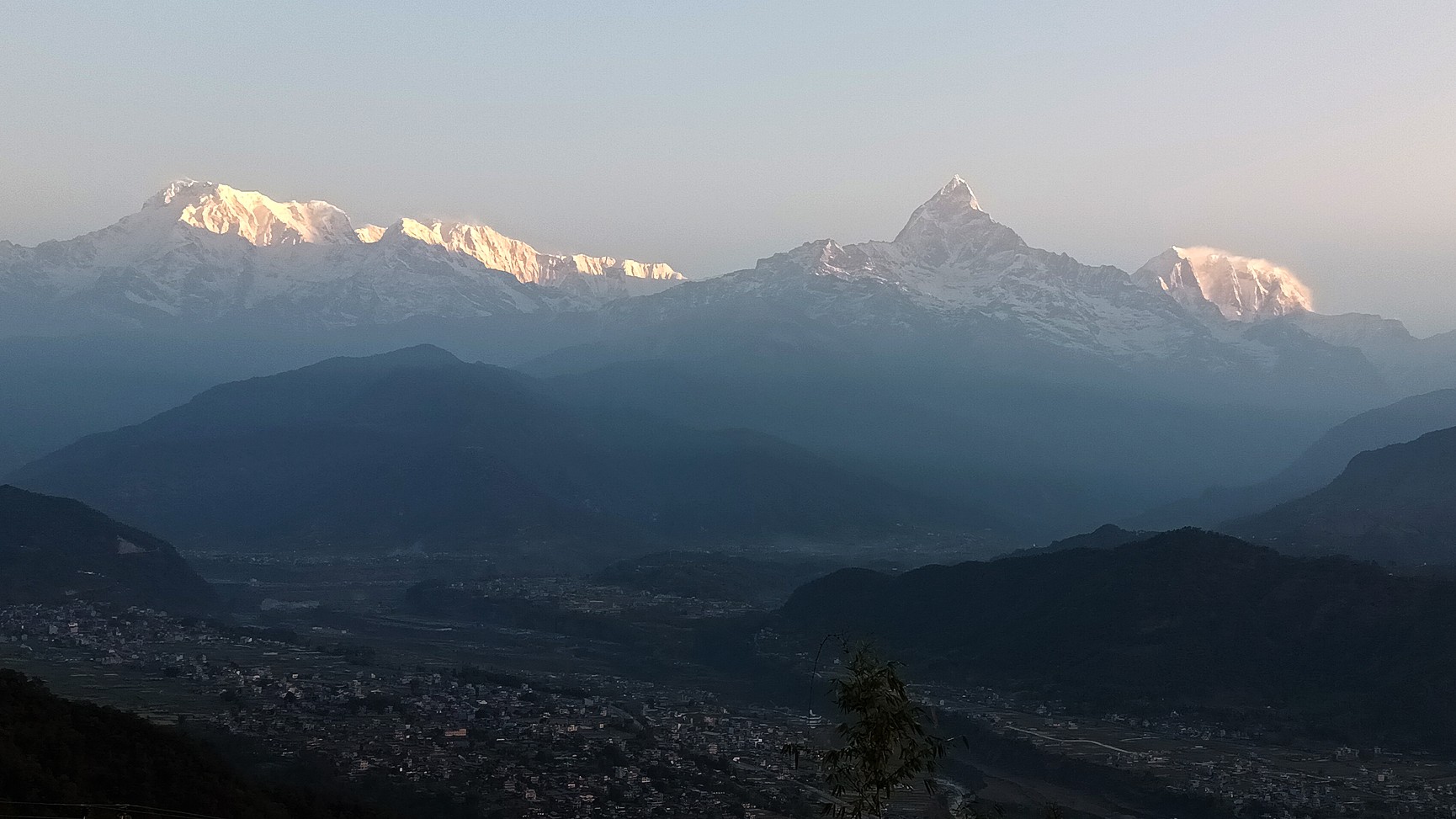 Autobusem trvá 200 km do Pokhary kolem 8 hodin, většinu času se projíždí po rozbité silnici nebo staveništěm. Tradiční nepálský populární jogurtový nápoj lassi. Svítání s výhledem na masív Annapuren a horu Mačapučare (Machhapuchhre - nepálsky Rybí ocas) vysokou 6.993 m n.m. Jezero Phewa. Vrchol Pumdikot se sochou boha Šivy.